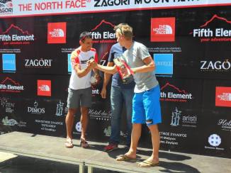 Inizia la seconda salita, la gara sembra già aver preso una sua forma: in testa, da solo, Dimitris Theodorakakos, già campione nazionale di maratona e uno dei più forti atleti del Team Salomon International. Dietro, a circa 7′ siamo io, Iraklis Moisidis, Fanis Arkoumanis e Ioannis Papailas (chiedo già scusa perché so che avrò sbagliato a scrivere i nomi…). Dopo una rampa di 700 m in meno di 3 km si arriva sui pascoli verdi verso il Dragonlake, anche qui l’ambiente è incontaminato, e i cavalli selvatici che incontriamo non sembrano disturbati dalla nostra presenza. Dopo il giro del lago e la salita al Rifugio Astraka (2000 m) inizia la seconda discesa, che ci porta a Papigo, dove è allestito il ristoro con le sacche che abbiamo consegnato la mattina. Ci arriviamo in 5h11 (km 44 e 3400 D+) e dopo una sosta di qualche minuto per riempire i serbatoi ci buttiamo nel Vikos Gorge, una gola da Guinness World Record per la sua profondità e lunghezza (20 km). Da qui inizia la parte più dura, non tanto dal punto di vista altimetrico, ma per il caldo. In circa un’ora e mezza percorriamo la gola, poi si esce e si sale a Monodendri, al km 60. Da qui attraverso continui saliscendi e passando per paesini nei quali il tempo si è fermato si arriva a Kipi, dove inizia l’ultima salita, circa 7 km con 700 m D+, versante sud, temperatura ben oltre i 30°… In testa sempre Dimitris, dietro invece il gruppetto si è frantumato e siamo rimasti solo io e Fanis, con quest’ultimo che sembra essere più fresco di me. Infatti sulla salita verso le Scale di Tsepelovo riesce a guadagnare qualceh minuto. Dallo scollinamento si vede l’arrivo, mancano 2 km, una breve discesa di 200 m di dislivello ci riporterà a Tsepelovo. Non è difficile, ma dopo 10 ore di gara anche fare le scale di casa diventa un’impresa. Ormai sono sicuro del mio terzo posto e finisco la mia prima 80 km con un posto sul podio e con negli occhi tutte le meraviglie che ho ammirato in questo viaggio!