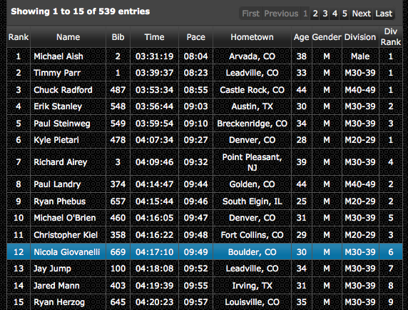 I knew that my shape wasn’t good, I was there just for fun and I didn’t care about the result. So I started slowly, I didn’t know the guys in the leading group and I only thought to my race. My legs were heavy because of a workout on a steep treadmill a couple of days before so the first uphill for me was tough. After the first 2 miles there was a short downhill, which was good to recover and to choose the right pace to keep in the next uphill. I passed the first aid station (mile 6, 13th place) with good feeling, and the next downhill gave me more motivation. I kept going with a good pace until the mile 10 (aid station #2, 10th place), just before the long uphill to the Mosquito Pass. The uphill to the Mosquito Pass was steep (and it was above 12,000 ft), I walked a lot, but I caught and passed a couple of guy. In the last part I had good feeling (13,200 ft). I started the downhill very fast, in the first technical part I was flying. I caught two guys (and then I was in 5th place). Unfortunately, after that downhill, there were two more uphills… short, but steep. After the 18th miles I bonked, I felt bad, I had nausea and I couldn’t drink or eat. “WTF, I was running fast and feeling good. I was doing a great race even if I didn’t prepare it“… and maybe this is WHY I bonked!! I tried to keep going fast, but also in the downhill I could not push hard. My muscles sore, my head was somewhere else. But I was happy (don’t ask me why). I finished the race in 12th place, loosing about 20′ in the last 6 miles.