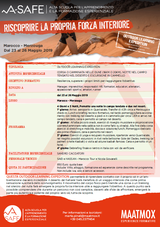 Grazie all’organizzazione di A-SAFE e MAATMOX nel 2019 sarà possibile partecipare ad un “OUTDOOR LEARNING EXPEDITION” in Marocco (dal 23 al 26 maggio).