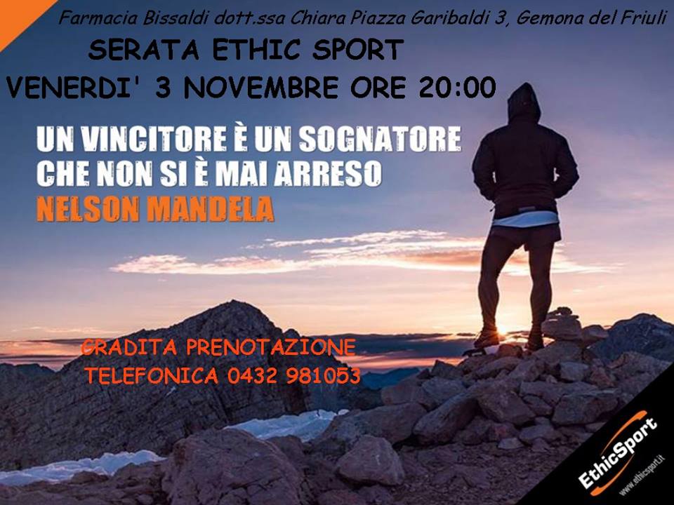 Venite venerdì 3 novembre alle 20.00 presso la Farmacia Bissaldi in centro a Gemona del Friuli per capire come sono fatti gli integratori e quando andrebbero assunti (interverrà un “uomo EthicSport” competente in materia!)… Poi, se non sarete ancora stufi, vi potrei anche raccontare come e quando li assumo io durante le fatiche in montagna (allenamenti e gare)…